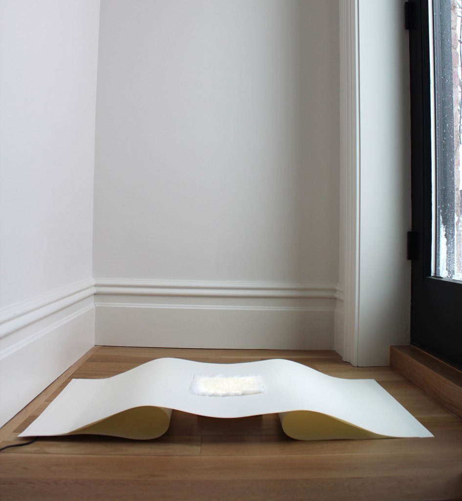 the center piece is made from two scraps of my old bedsheets. these are quilted with grains of white rice, each sewn into a private circle with silk thread. no knots were used. the accumulated weight of this scrap holds the three sheets of rag paper in place as a temporary architecture-in-fiber.