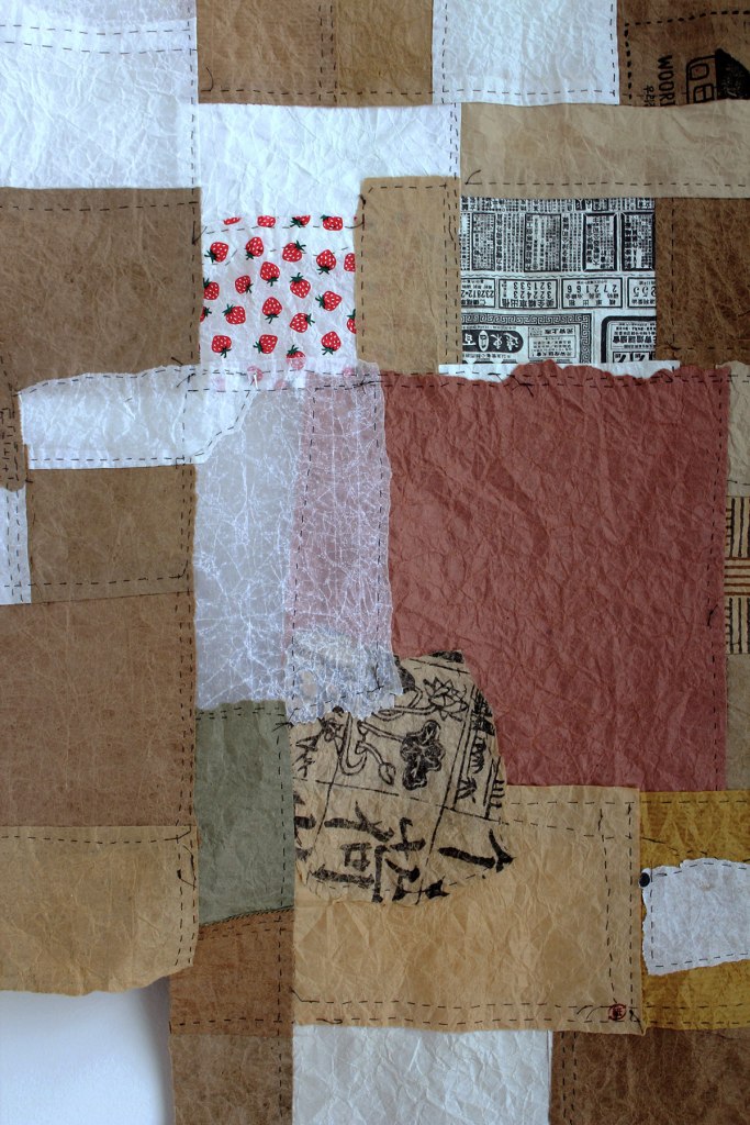 a growing patchwork quilt of hand-felted (momigami) packing or packaging papers gathered from daily errands. holes have started to appear through my handling, and i patch these with appliqued paper. the sewing and the felting are both cyclical processes re-enforcing, wearing out. these are sewn together by hand using silk thread. my hope is for this to be bed-sized.